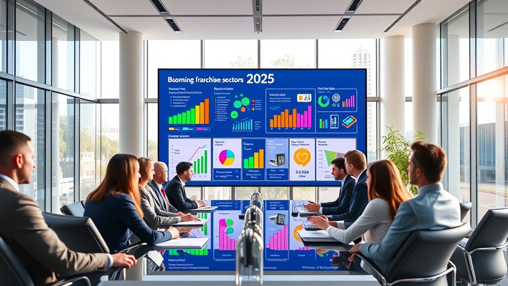 In 2025, franchise growth will surge in emerging markets like Africa, Southeast Asia, and Latin America, driven by rising middle classes and local adaptations. Digital transformation will also be essential, with more online platforms, contactless transactions, and mobile loyalty programs enhancing customer experience. Additionally, virtual and hybrid models will expand, offering flexible, delivery-focused options suited to evolving consumer preferences. Keep exploring to discover the full spectrum of innovative franchise trends shaping the future.