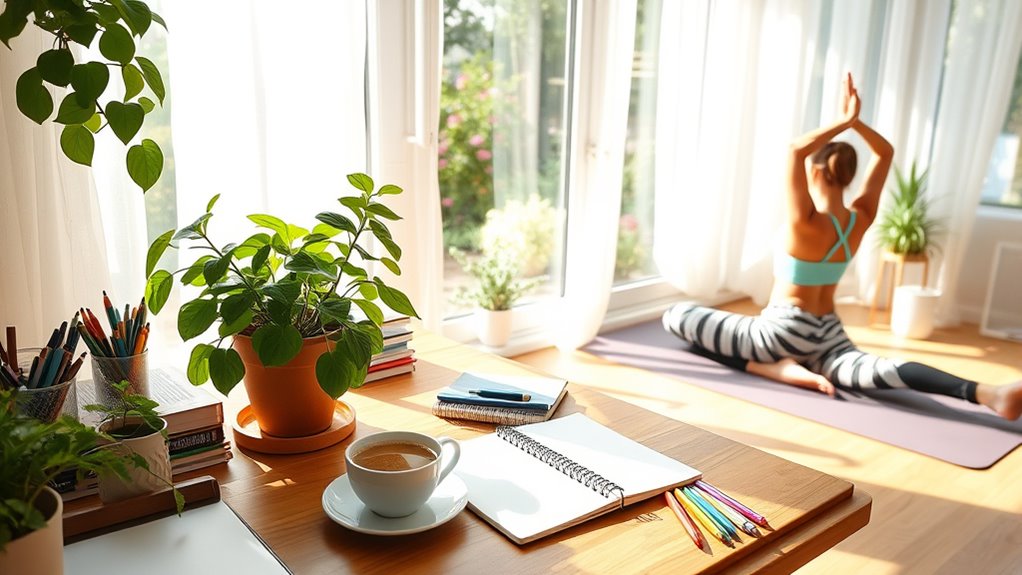 You can enhance sustained creativity by establishing routines that include mindfulness practices and effective time management techniques. Start your day with brief meditation or deep breathing exercises to clear your mind and boost focus. Use time management methods like the Pomodoro Technique to maintain productivity without burnout. Incorporating these habits into your daily schedule helps you stay creatively energized, focused, and consistently inspired, ensuring your creative flow remains strong over time.