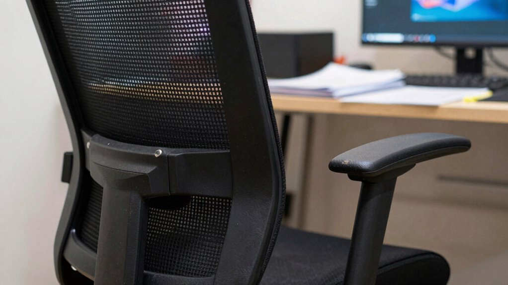 To guarantee your ergonomic chair continues to support proper posture and comfort, make it a habit to regularly check and fine-tune its settings. Start by evaluating the seat height, backrest angle, and armrest positions. Adjust these to match your body’s needs, ensuring your feet are flat on the floor and your hips are level. When selecting a chair, consider color options that match your workspace aesthetic, and check material durability for long-term use. Regularly inspect for loosened screws or worn padding. Use this quick reference:
