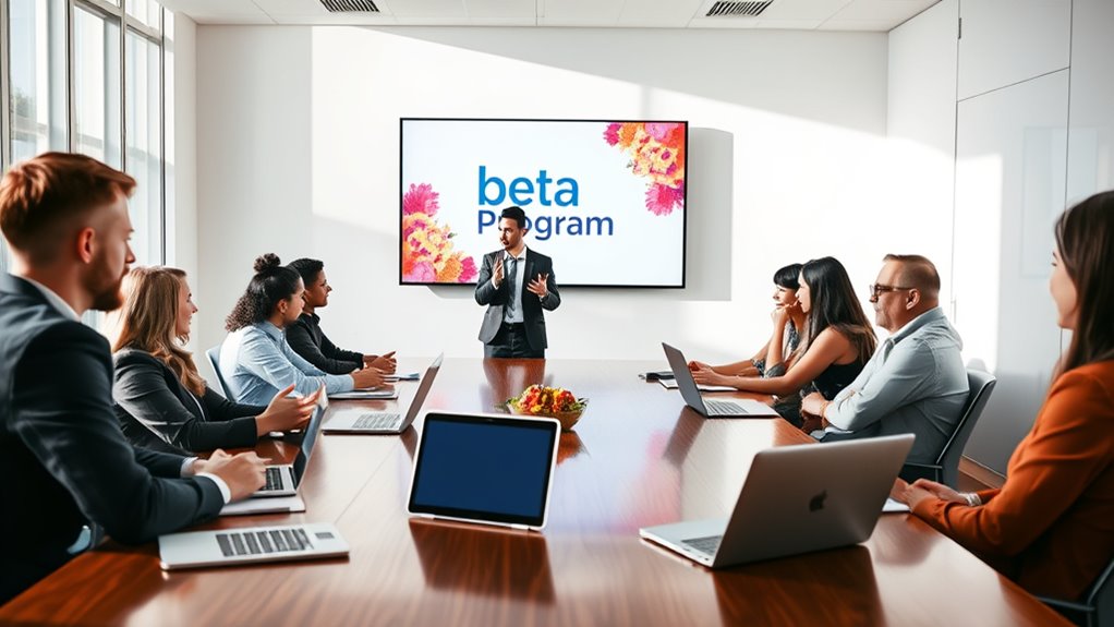 To effectively launch a beta program and gather feedback, start by clearly explaining your product’s purpose and guiding users through simple tutorials. Encourage exploration and use surveys, in-app prompts, or direct communication to collect honest feedback. Monitor user interactions and track feature usage with analytics tools. Make small improvements based on insights, and respond promptly to user concerns to build trust. Continuing will help you master refining your product efficiently.