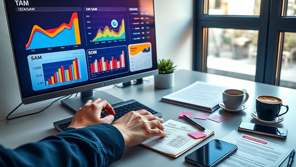 When you need to quickly calculate TAM, SAM, and SOM, consider using Excel spreadsheets or online calculators. Excel offers customizable templates and formulas to streamline your analysis, making it easy to update data on the fly. Online calculators are user-friendly and fast, often requiring just inputting key data points. Both tools help you perform rapid, accurate market sizing, especially useful for small markets or quick assessments.