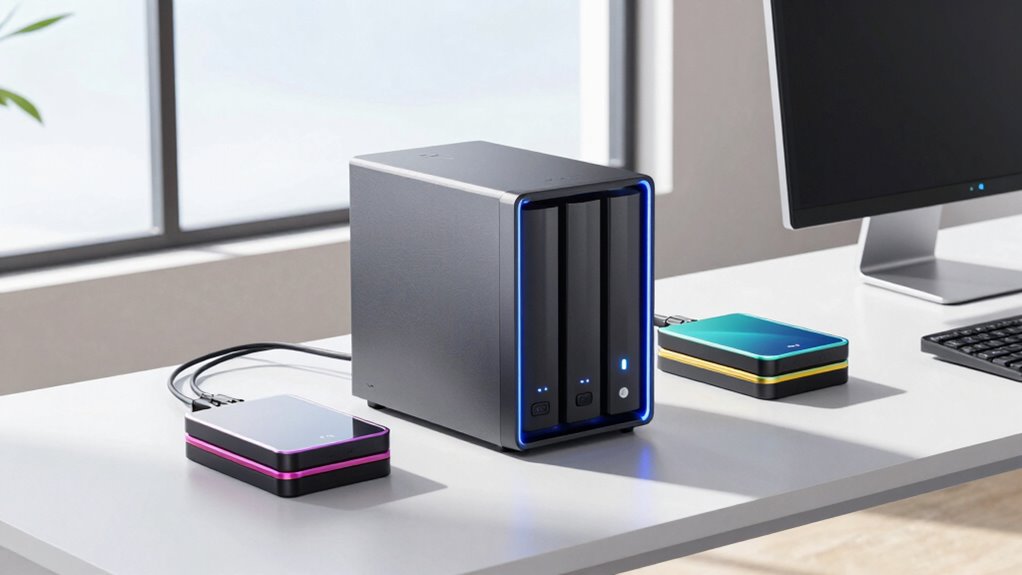 Are you planning for your NAS system to grow alongside your data needs? To guarantee future expansion, choose scalable drives and configurations that support growth. Look for NAS models with multiple drive bays and flexible RAID options, allowing you to add storage without disrupting current operations. Cloud integration is essential; it enables seamless backups, remote access, and expansion beyond physical drives. Prioritize user accessibility by selecting systems that are easy to upgrade and manage, even for non-technical users. Consider NAS solutions offering modular storage options, so you can grow incrementally as your data volume increases. This approach minimizes costs and downtime while maximizing flexibility. Planning for future expansion now ensures your NAS remains reliable, accessible, and capable of handling your evolving storage needs.