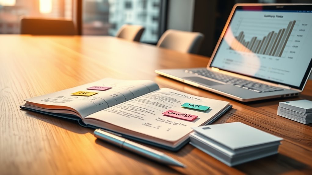 To structure SAFE and convertible notes effectively, focus on balancing valuation caps and discount rates to attract investors while protecting your company’s future equity. Set a fair valuation cap to safeguard early supporters and include a discount rate to reward their risk. Clearly define how these terms interact to guarantee transparency. Consider your company’s growth and funding goals when fine-tuning these details, and you’ll create an appealing, balanced deal. Keep exploring to master the nuances of successful structuring.