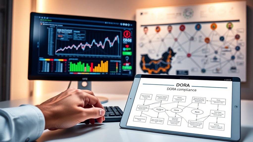 To navigate the Digital Operational Resilience Act (DORA), focus on building a resilient digital environment by integrating risk management into your daily operations. Identify vulnerabilities, assess their impacts, and implement proactive measures to mitigate threats. Guarantee compliance through clear policies, regular audits, and automated workflows. Invest in advanced technology for threat detection and communication. Staying informed and adaptable is key, so explore further to master the strategies that will strengthen your organization’s resilience under DORA.