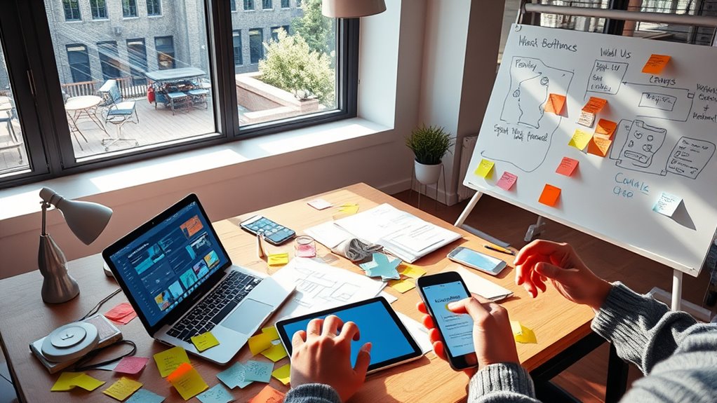 To choose the right features for your MVP, focus on feature prioritization by identifying what delivers the most value to users first. Use user story mapping to visualize user needs and workflows, helping you spot essential features. Concentrate on core functionalities that solve problems or satisfy needs, and avoid overloading your MVP with non-essential features. This approach guarantees you develop a lean, effective product that resonates with your target audience quickly.