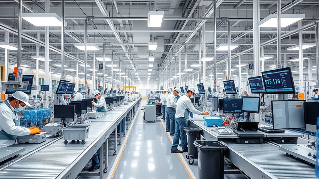 Have you ever wondered how companies maximize efficiency while minimizing waste? It all comes down to implementing lean operations, where every process is scrutinized to eliminate unnecessary steps and resources. A core aspect of lean is effective inventory management, which guarantees you’re not overstocking or understocking materials. Proper inventory management helps keep your workspace organized, reduces storage costs, and prevents delays caused by missing parts. When you manage inventory wisely, you can respond more quickly to customer demands and avoid the costs associated with excess inventory sitting idle. This careful balance is essential for maintaining flow and reducing waste across your entire operation. For example, utilizing reliable backup power systems ensures that operations can continue smoothly even during disruptions, which helps prevent downtime and associated waste.