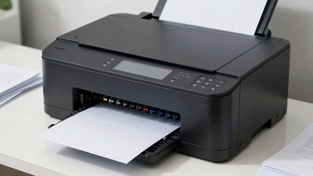 Choosing a printer with the right duty cycle guarantees it can handle your office’s printing demands without frequent breakdowns or slowdowns. Duty cycle measures how much printing a printer is designed to do in a month, reflecting its capacity to sustain high-volume tasks. Selecting a printer with an appropriate duty cycle extends its printer lifespan, guaranteeing it lasts longer and operates reliably. Understanding the printer safety considerations can help prevent potential hazards and ensure the longevity of your equipment. Proper requirements traceability also plays a vital role in selecting equipment that meets your organization’s compliance standards and operational needs. Additionally, ensuring the duty cycle aligns with your office’s print volume prevents overuse that could lead to premature failure. Considering the emerging trends in digital publishing can help your organization stay ahead in adopting efficient and innovative printing solutions. Being aware of the product specifications ensures that the printer’s capabilities match your specific needs and reduces the risk of overloading the device.