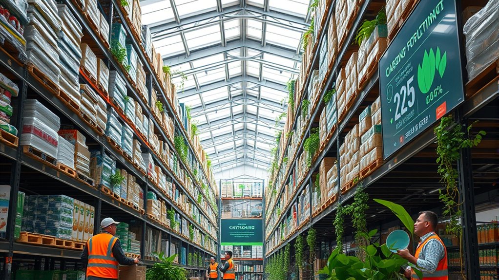 You can effectively measure sustainability performance in your supply chain by tracking your carbon footprint regularly and setting clear reduction targets. Engage stakeholders at every level to gather insights and foster accountability. Use transparent reporting and data analytics to monitor progress, identify areas for improvement, and make certain your sustainability efforts align with your overall business goals. This approach helps you create a more sustainable, responsible supply chain.