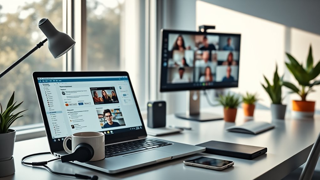 You can guarantee seamless remote team communication by using collaborative platforms like Slack or Microsoft Teams, which keep everyone connected. Incorporate real-time chat features to facilitate quick, clear exchanges and reduce misunderstandings. These tools allow you to organize conversations, share files instantly, and maintain ongoing dialogue, ensuring your team stays aligned and productive regardless of time zones. Regularly update and train your team on these tools to maximize their effectiveness.