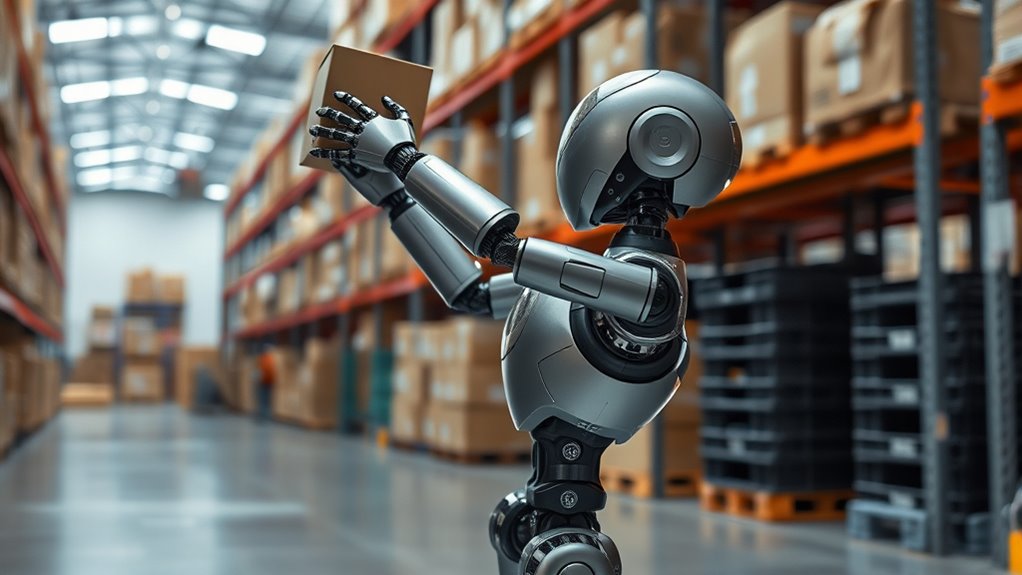 As you observe these humanoid robots, you’ll notice how their design emphasizes mobility. They are built to walk upright, climb stairs, and carry loads, mimicking human movement with remarkable fluidity. This mobility is made possible by sophisticated joint mechanisms and real-time control systems that coordinate their limbs with incredible precision. Their robotic dexterity isn’t just about strength; it’s about finesse—handling delicate packages, inserting items into tight spaces, or stacking goods in tight quarters. This combination of mobility and dexterity enables them to operate in environments designed for humans, making them versatile assets in logistics.