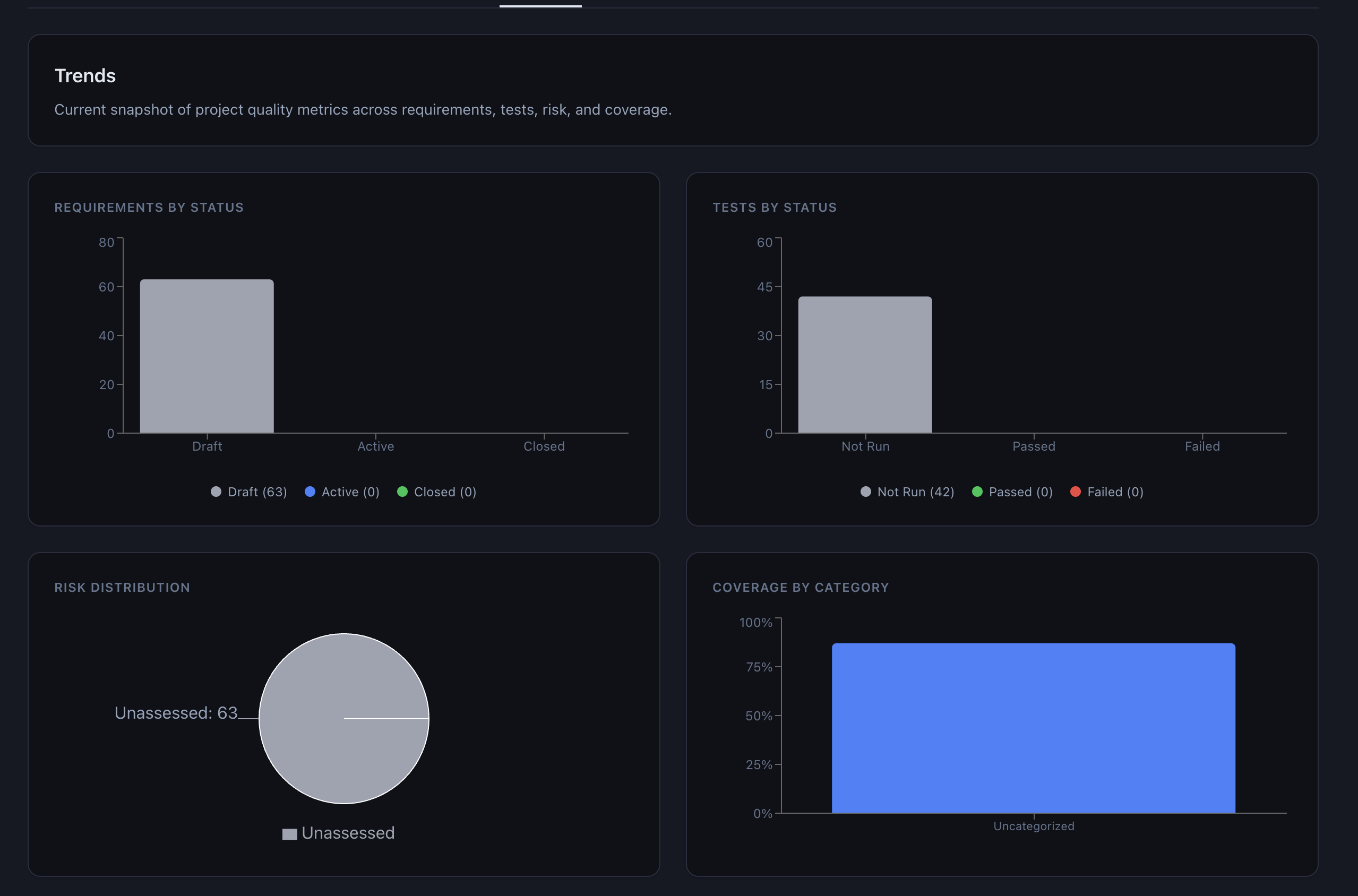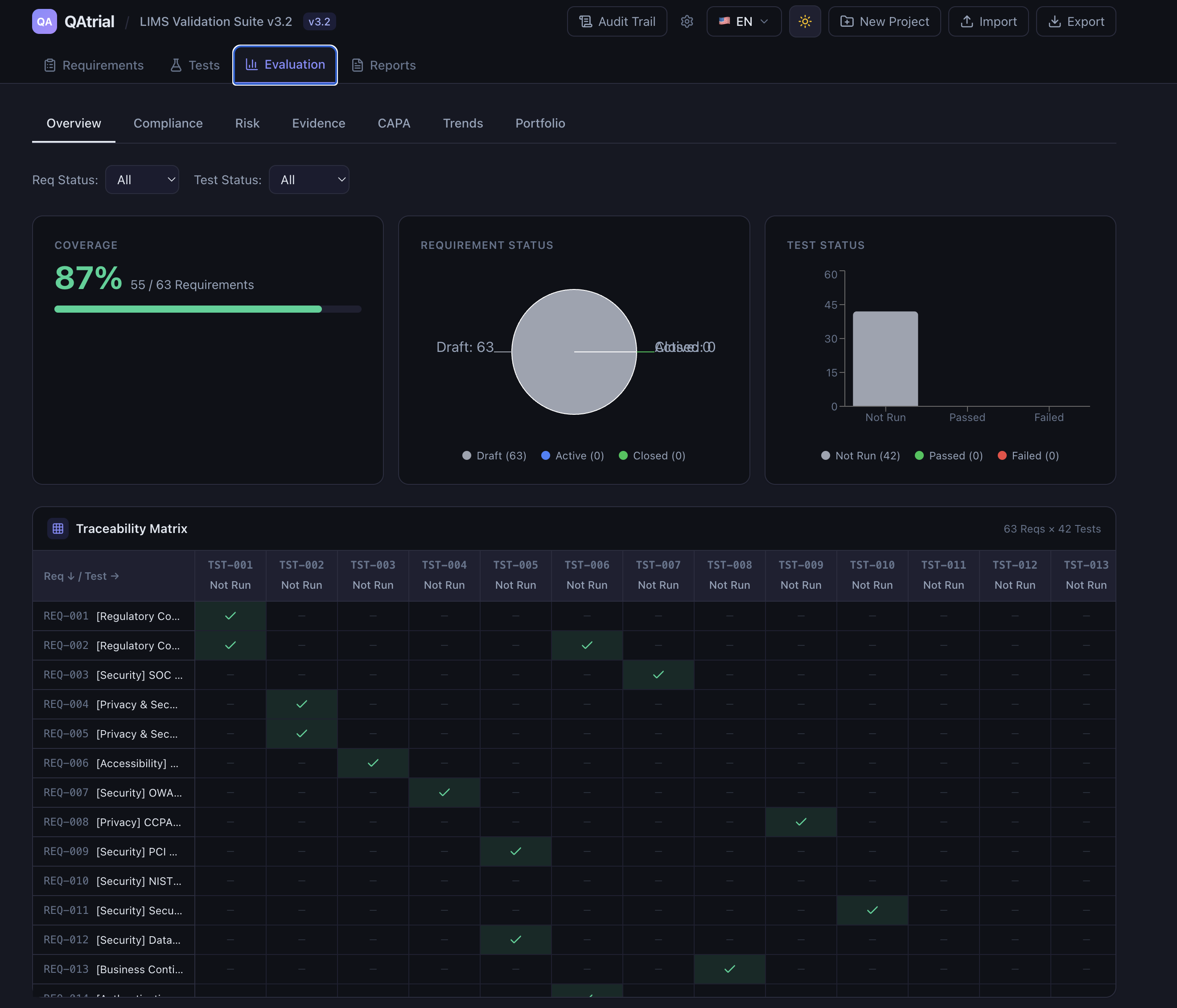 If you decide QAtrial is not the right fit, you export your project as JSON and migrate to whatever tool you choose. Your requirements, tests, audit trail entries, and risk assessments are yours. Try doing that with DOORS or MasterControl.