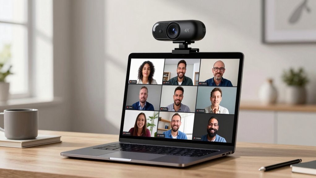 Ensuring your 4K webcam is compatible with your devices is essential for smooth Zoom meetings. First, check that it supports your device’s connection type, whether USB-A, USB-C, or Thunderbolt, to avoid any compatibility issues. Next, verify that the webcam’s system requirements match your operating system, like Windows, macOS, or Linux, so it functions properly. It’s also important to contemplate your device’s hardware, such as processor and RAM, to guarantee optimal performance during meetings. Additionally, confirm that the webcam’s software or drivers work with your existing conferencing apps. Finally, decide if you prefer plug-and-play models for quick setup or those requiring additional drivers, aligning with your ease of use and setup preferences. This ensures a seamless connection across your devices.