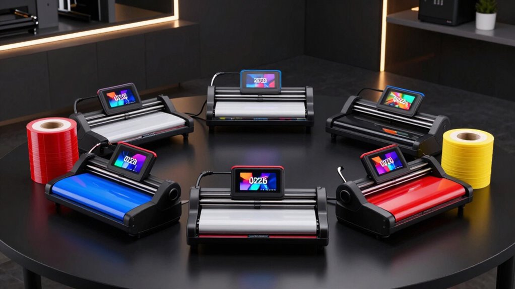 Accurate cutting is the cornerstone of professional branding, and several features directly influence this precision. Advanced blade mechanisms and adjustable force settings help guarantee clean, accurate cuts across various materials. High-resolution control systems, like LCD screens and digital interfaces, enable precise adjustments and consistent results. Features such as dual blades or fine-point blades allow for intricate, detailed designs with minimal errors. Stable feed mechanisms and robust construction contribute to consistent accuracy, even on large or lengthy projects. Additionally, the ability to calibrate and adjust cutting parameters helps accommodate different material thicknesses and types, ensuring versatility. When choosing an adhesive vinyl cutter, prioritize these cutting precision features to achieve sharp, professional-quality branding results every time.