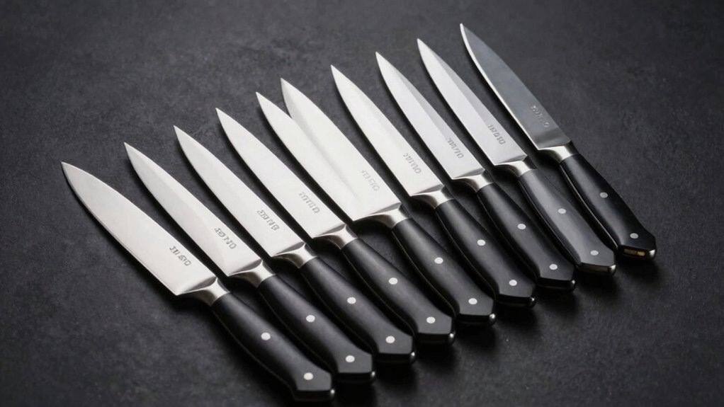 Choosing AUS-10 kitchen knives means paying close attention to the steel’s quality, since it directly impacts performance and longevity. AUS-10 steel is renowned for its corrosion resistance and ability to hold a sharp edge. Its high carbon content, around 1.0%, boosts hardness and durability, making it perfect for precise cuts. Elements like cobalt and molybdenum further improve wear resistance and toughness, ensuring the blade withstands daily use. Proper heat treatment is essential to reach an ideal hardness of about 60 HRC, which balances sharpness with durability, preventing brittleness. Additionally, AUS-10’s fine grain structure allows for a refined edge geometry, resulting in superior sharpness and cutting precision. In short, the quality of the steel directly influences how well your knife performs over time.