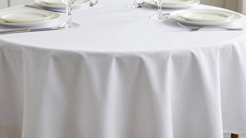Choosing the right fabric material is essential for guaranteeing your branded tablecloth remains wrinkle-free and looks polished. High-quality options often use polyester or polyester blends because their synthetic fibers naturally resist wrinkling. The fabric’s weave type, like jacquard or plain weave, also influences how well it stays smooth and wrinkle-free. Fabrics with a higher thread count tend to be sturdier, helping them resist creases over time. Many wrinkle-free tablecloths are treated with special finishes, such as heat-setting or chemical coatings, to boost their resistance. Selecting fabrics that are both durable and properly finished guarantees they keep their crisp appearance after multiple washes. Prioritizing material quality ensures your tablecloths remain elegant and functional, season after season.