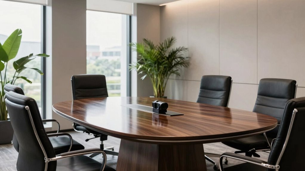 Choosing the right size and capacity for a conference table is essential to creating an effective meeting space. I always consider how many people will use it, as typical seats range from 4 to 12 for small to medium rooms. The table’s dimensions usually determine capacity; for example, a 6-foot table comfortably seats 6-8 people. I avoid overly large tables in small rooms, which can waste space and hinder interaction, and steer clear of too-small tables that restrict movement. The shape matters too—round tables encourage equal participation, while rectangular ones suit larger, formal meetings. I also ensure the table’s size accommodates essential equipment like laptops or projectors without crowding the surface, balancing functionality and comfort.