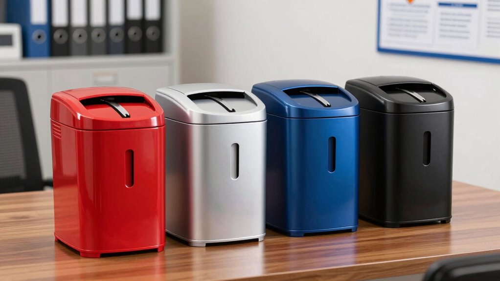 Selecting the right shredder type is essential for meeting compliance standards without breaking the bank. Cross cut shredders are a popular choice because they cut paper into small rectangles, offering higher security levels like P-3 or P-4, ideal for sensitive documents. Strip cut shredders are more affordable and slice paper into long, thin strips, usually meeting lower security standards such as P-2, suitable for less sensitive info. Micro cut shredders produce tiny particles, providing the highest security level for highly confidential data. If you need to destroy credit cards or IDs, card shredders are designed specifically for that purpose, often with dedicated slots. For versatile needs, combination shredders handle multiple media types, including paper, credit cards, DVDs, and small metal pieces, maximizing value and security.