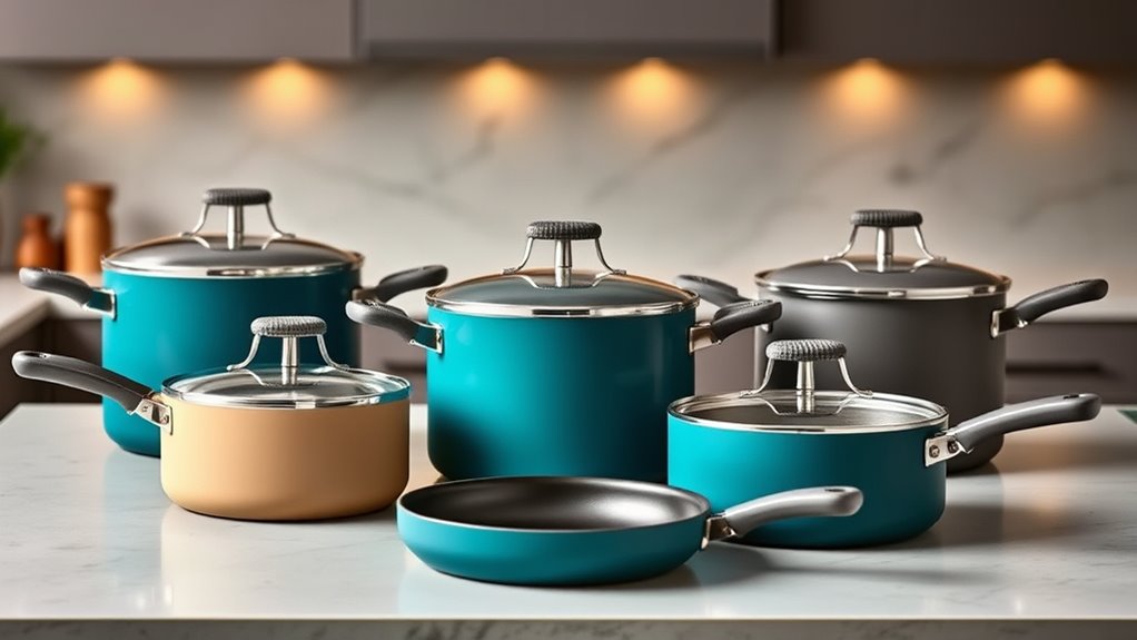 Selecting a cookware set that matches my stovetop is key to guaranteeing ideal performance and durability. I check if the set is compatible with all types, including induction, gas, electric, and glass cooktops. For induction, I look for a magnetic base or an extended bottom design, which helps with quick, even heating. I also verify that the materials, like ceramic-coated aluminum, work well across different heat sources without warping or damage. Handles should be heat-resistant and securely attached, especially on high-temperature stoves. Additionally, I consider whether the set includes versatile pieces with lids that fit multiple cookware components. This assures seamless use regardless of my stovetop type, maximizing efficiency and lifespan.