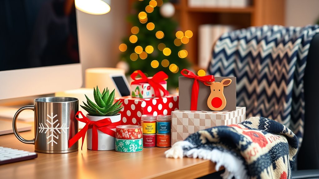 Looking for Christmas gifts under $25 that will really impress your coworkers? I recommend a festive 8-pack of scented candles, which create a cozy holiday vibe and are eco-friendly. A cheerful crochet taco adds humor and positivity. A ceramic ornament celebrating team spirit makes a lovely keepsake. A holiday mug paired with cozy accessories brightens their day, and a face mask bundle offers a relaxing treat. Keep going, and you’ll find even more perfect office gift ideas!