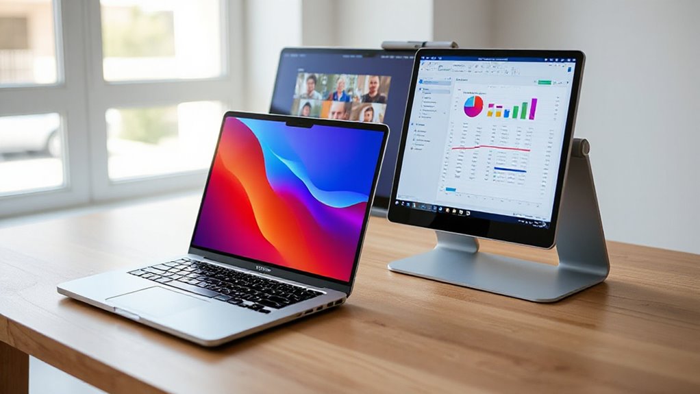 When it comes to portable dual-screen monitors, weight and size are crucial factors that can make or break your remote work setup. A lightweight monitor, typically weighing between 1.07 to 3.5 pounds, is easy to carry during commutes or travel. Slim profiles, often under 0.25 inches thick, enhance portability and fit comfortably in backpacks or laptop bags. Foldable and compact designs allow quick setup and pack-away, reducing space requirements for mobile workstations. Materials like aircraft-grade aluminum and shockproof plastics strike a balance between durability and weight, ensuring your monitor withstands daily use without being bulky. Integrated stands or foldable features add convenience, making these monitors flexible and easy to handle without sacrificing portability.