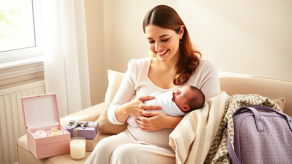 While practicality guarantees that gifts serve a purpose, adding sentimental value creates a deeper emotional connection. I find that sentimental gifts often become cherished keepsakes, reminding new moms of their incredible journey into motherhood. Personalized items, like engraved ornaments or custom caps, amplify emotional significance and help create lasting memories. Gifts that symbolize growth, such as pregnancy milestone ornaments, make moms feel appreciated and celebrated. Items that evoke feelings of love and support, like heartfelt cards or meaningful keepsakes, also strengthen emotional bonds. Choosing gifts with sentimental meaning can provide comfort and joy during the overwhelming early postpartum period. These thoughtful tokens remind moms of their strength, love, and the special moments they’ve experienced, making these gifts truly meaningful and memorable.
