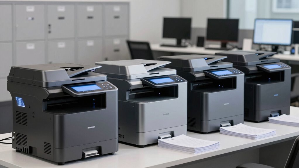 Think of high-speed scanners as digital safes—they come packed with security features like encryption, user authentication, and secure data transmission. I once used a scanner with biometric access, making it almost impossible for unauthorized folks to peek at sensitive documents. These features guarantee your agency’s data stays protected, giving you peace of mind while handling confidential paperwork at lightning speed.