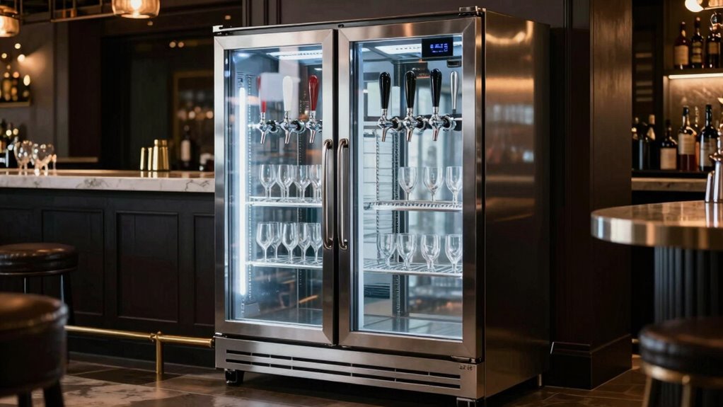 A high-ticket kegerator’s versatility hinges on its ability to support different keg sizes and adapt to various beverage needs. Supporting full, quarter, and sixth barrel kegs ensures I can serve a wide variety of drinks, from craft beers to specialty brews. Adjustable temperature controls, ranging from 32°F to 50°F, let me customize the environment for different beverages, whether beer or non-alcoholic options. Convertible interiors and extra shelves provide flexibility, allowing the unit to switch between draft beer dispensing and storage. Mobility features like casters with locking mechanisms make repositioning easy for events or different locations. Compatibility with various keg types and easy installation of accessories, such as dual taps or CO₂ tanks, further enhances its adaptability, making it perfect for both home and commercial use.