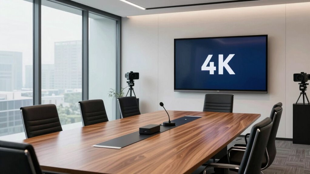 Ensuring high-quality audio and video is crucial for effective hybrid meetings, as clear communication hinges on reliable technology. I look for high-definition components like 1080p or 4K cameras and HD audio to guarantee visuals and sound are crisp. Features such as auto-framing and speaker tracking help focus on active participants, making virtual interactions more natural. Noise cancellation minimizes background distractions, improving clarity. Multiple microphones with wide pickup ranges guarantee everyone’s voice is heard, regardless of seating arrangements. Compatibility with platforms like Zoom or Teams is essential for seamless integration. Additionally, support for various outputs—HDMI, USB, NDI—and advanced compression technologies ensures smooth streaming and recording without lag. Prioritizing these factors helps create a professional, engaging hybrid meeting experience.