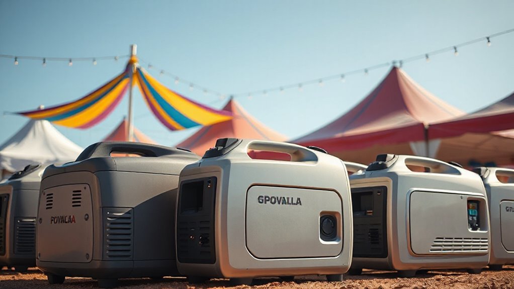 When a sudden power surge hits, inverter generators respond quickly, just like a reflex. They automatically adjust their voltage and frequency, smoothing out fluctuations and protecting your equipment. This intelligent handling guarantees your event runs smoothly without hiccups. I’ve seen these generators recover seamlessly from surges, providing reliable power when you need it most. It’s like having a vigilant guard that keeps your event powered and safe, no matter what surprises come up.