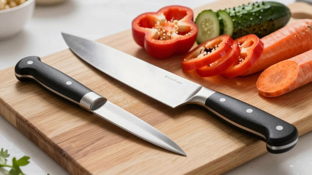 I find that high-carbon stainless steel is ideal for precision cutting because it’s incredibly sharp and holds its edge well. Ceramic blades are also excellent—they’re super sharp and maintain their precision over time, especially for delicate tasks. For even finer control, some prefer Damascus steel for its strength and aesthetic appeal. Ultimately, choosing the right material depends on what you’re slicing and how often you need to sharpen your knife.
