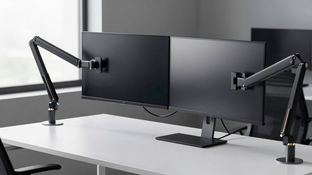 Selecting the right monitor arm involves considering how it mounts to your desk and the flexibility it offers for positioning your screens. There are several mounting options, like C-clamp, grommet, or wall-mount, each suited to different desk types and thicknesses. Full-motion arms support tilt, swivel, and rotation, letting you customize your ergonomic setup. Adjustable extension and height features help position monitors at the perfect viewing angle and distance. Compatibility with VESA standards (75x75mm or 100x100mm) is essential for secure attachment. Some mounts include quick-release VESA plates and tool-free adjustments, making installation and reconfiguration straightforward. Overall, choosing a mount with flexible mounting options ensures your dual screens are both stable and adaptable to your workspace needs.