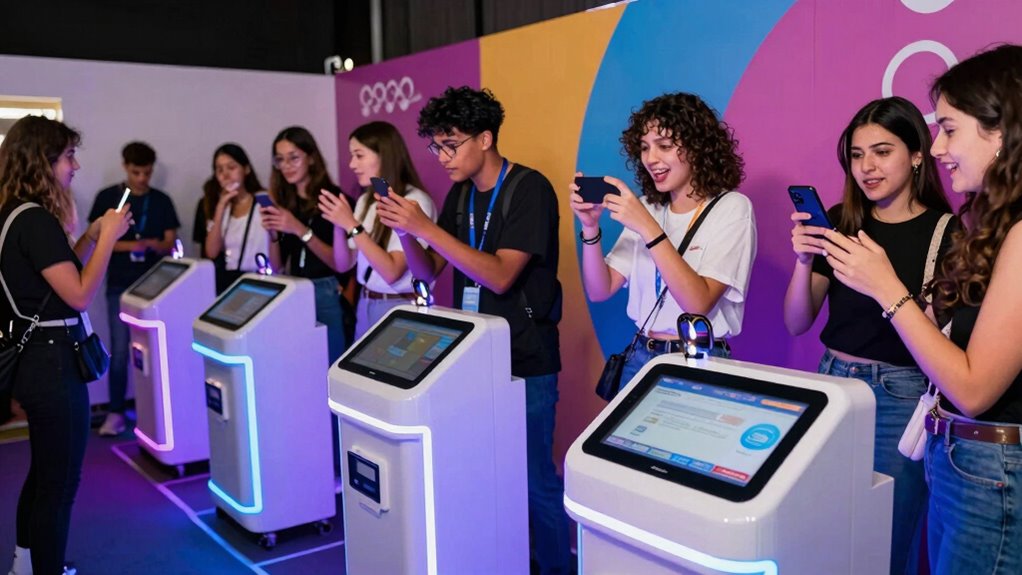 Effective lighting and mesmerizing effects are key to making photo booths stand out during brand activations. High-quality lighting, like RGB ring lights with adjustable brightness and color modes, guarantees photos are clear and visually appealing, no matter the environment. Special effects such as slow-motion, GIFs, and digital props add fun and engagement, making images more memorable and boosting brand visibility. Proper illumination assures consistent image quality, even in varied ambient lighting conditions. Dynamic lighting effects synchronized with music or themes create immersive experiences that resonate with attendees. Additionally, adjustable lighting features allow customization to match brand colors, event aesthetics, and promotional goals. This flexibility helps reinforce brand recognition and ensures the photo booth complements your overall activation strategy.