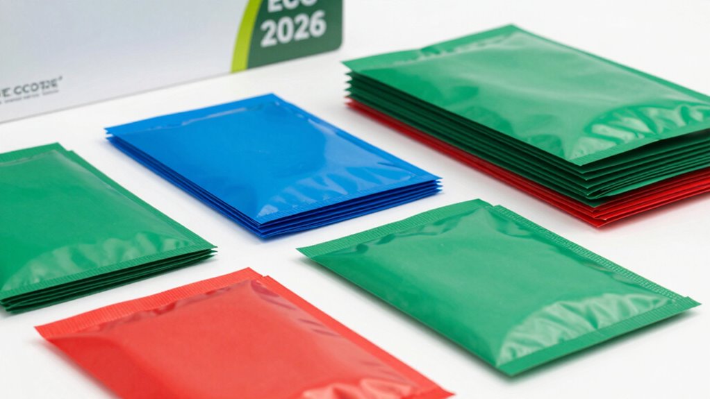 Choosing eco-friendly poly-mailers requires paying close attention to their material sustainability standards, as these directly impact their environmental footprint. I look for products that meet recognized standards like ASTM D6400, EN13432, BPI, or OK COMPOST HOME, ensuring they’re compostable and biodegradable. It’s also important that the materials come from renewable sources such as PBAT, modified corn starch, or post-consumer recycled plastics, which promote sustainability. Certifications or labels confirming compliance with eco-friendly standards give me confidence in their responsible manufacturing. I also check that the materials are BPA-free, non-microplastic, and free from harmful chemicals, protecting both the environment and human health. Finally, I consider the degradation timeline, favoring materials that fully decompose within 15-18 months in landfills or 120 days in compost.