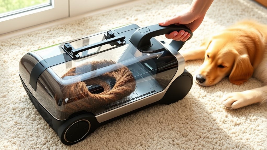 Since pet messes can be stubborn and require more than just basic cleaning, paying attention to specialized tools is essential. I look for features like pet hair removal brushes and tough stain tools that target embedded stains and odors effectively. Powerful suction combined with scrubbing functions helps lift pet stains from carpets and upholstery, making cleanup faster. Interchangeable or dedicated pet-specific attachments ensure I can thoroughly clean high-traffic and pet-accumulated areas. Self-cleaning tools and dual-action nozzles also boost ease of use and efficiency, saving me time and effort. Additionally, extended hoses and specialized nozzles allow me to reach hard-to-access spots, helping to eliminate residual pet odors and stains. These tools make a significant difference in achieving a spotless, odor-free home.