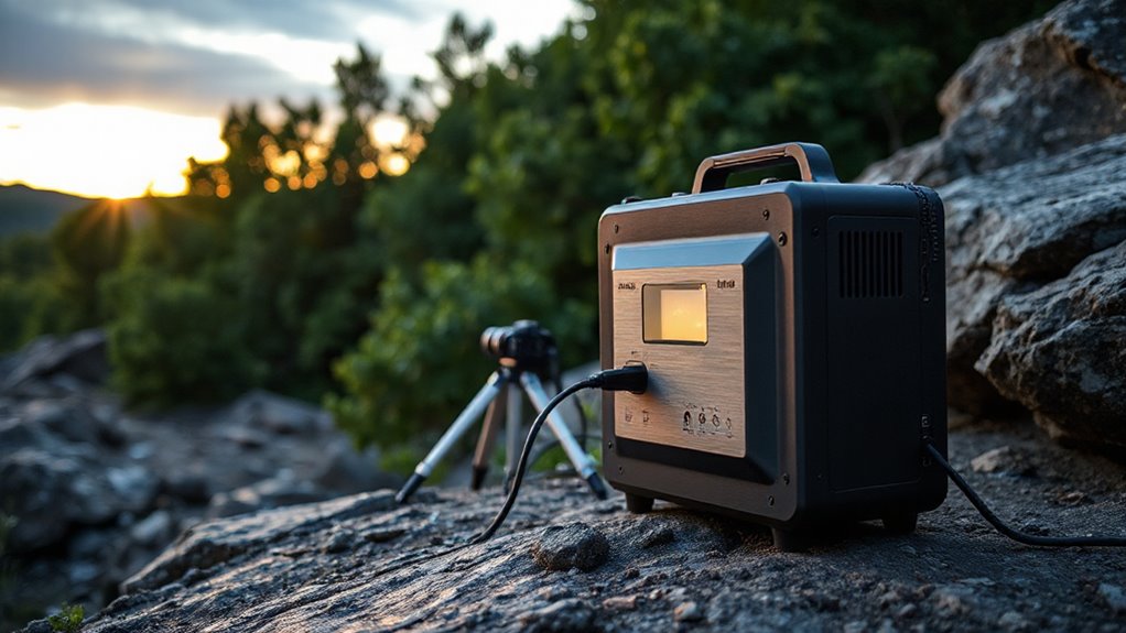 I can typically recharge portable power stations during a shoot within 4 to 8 hours, depending on the station’s capacity and available solar input. When I use high-wattage solar panels, I often get a faster recharge, which is vital for keeping my equipment powered throughout long shoots. I always plan my solar setup to make certain I have enough energy between shoots, so I’m never caught short.