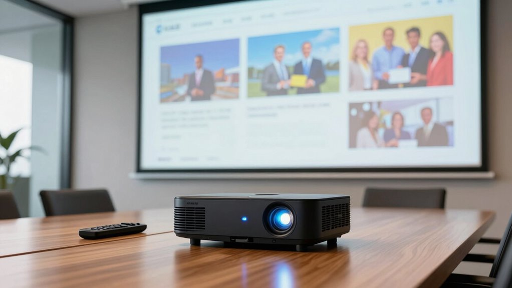 Think of your projector as a well-tuned instrument—regular maintenance keeps it humming smoothly. I always keep the lens clean and dust-free, and check the air filters periodically to prevent overheating. I also guarantee firmware is up-to-date for peak performance. Before meetings, I test the connections and brightness settings. This way, I avoid surprises and deliver seamless presentations that hit the right note every time.
