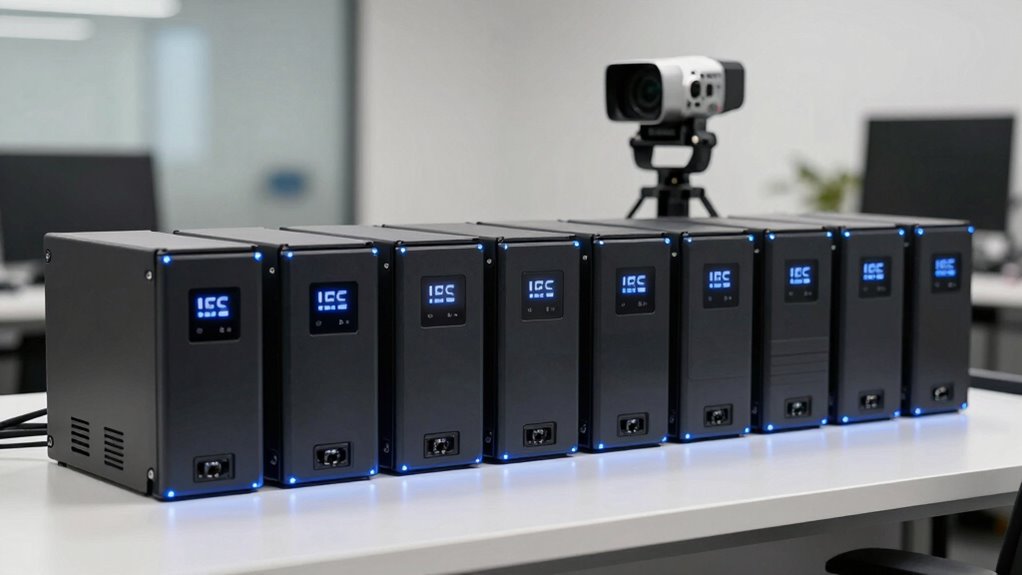 Yes, UPS systems can support multiple network devices simultaneously. I always check the total power load and verify the UPS’s capacity exceeds it. It’s crucial to select a UPS with enough outlets and sufficient wattage to handle all your equipment at once. Proper planning guarantees your entire network stays protected during outages, preventing data loss and downtime. Investing in a robust UPS makes managing multiple devices seamless and reliable.