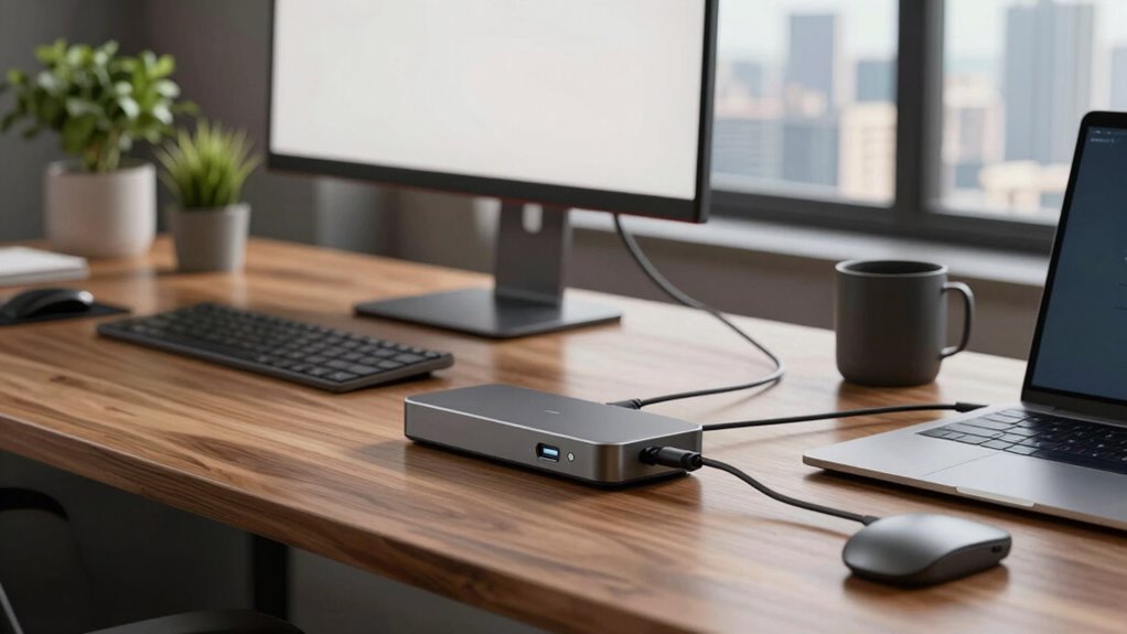 Choosing a USB-C docking station for your home office hinges on its display compatibility, which is vital for a seamless multi-monitor setup. You need to verify it supports the number and types of monitors you plan to connect, whether that’s dual or triple displays, and that it offers compatible ports like HDMI, DisplayPort, or VGA. Check that the maximum resolution and refresh rate meet your needs, such as 4K at 60Hz or higher for sharp visuals. Also, confirm that your laptop’s USB-C port supports video output protocols like DisplayPort Alt Mode or Thunderbolt 3/4, which are critical for multi-monitor support. Ultimately, confirm the dock’s compatibility with your operating system, especially if you’re using macOS, which may have limitations like mirroring or single extended display modes.
