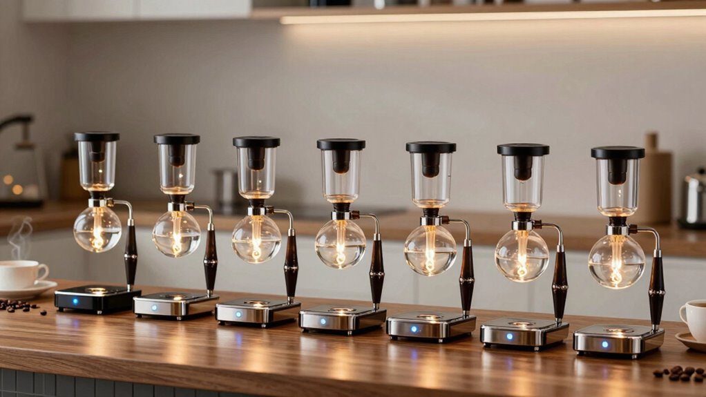 If you’re looking for the 6 best-rated electric coffee siphon brewers in 2026, I’ve got you covered. From modern models with precise digital controls to vintage-inspired designs, these brewers combine technology and style for perfect coffee. They vary in capacity, features, and ease of use, making it easy to find one that fits your needs. Keep exploring, and I’ll guide you through each option to help you choose the best one for you.