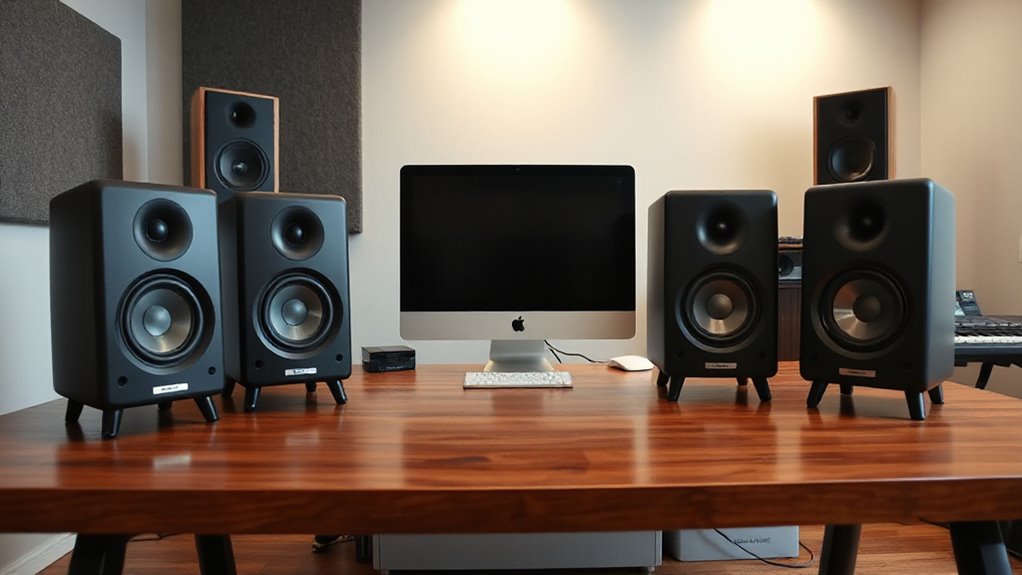If you’re looking for the 15 best studio monitor speakers for your home studio in 2026, you’ll find top options like the PreSonus Eris E7 XT, Yamaha HS5, and KRK Rokit 5, which offer clear sound, versatile connectivity, and compact designs. Whether you’re seeking budget-friendly models like Edifier R1280Ts or professional-grade monitors, there’s something for every setup. Keep exploring—you’ll discover detailed reviews and key features that help you choose the perfect pair for your needs.