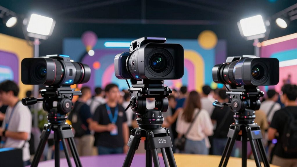 Waterproof and weatherproof ratings are like armor for your camera during outdoor events. They guarantee your gear withstands rain, splashes, and dust, preventing damage that could ruin your footage. With high ratings, I feel confident capturing moments in any weather, knowing my camera won’t falter. This durability is vital, especially when you’re amidst unpredictable conditions, giving you peace of mind to focus on creating stunning content.