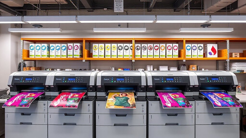 When it comes to high-volume production, I’ve found that printers like the Epson SureColor F570 and the Sawgrass Virtuoso SG1000 stand out for their speed. They’re designed to handle large workloads efficiently, with rapid print times that keep my workflow moving smoothly. If speed is your priority, these models deliver impressive results, allowing me to produce more in less time without sacrificing quality or reliability.