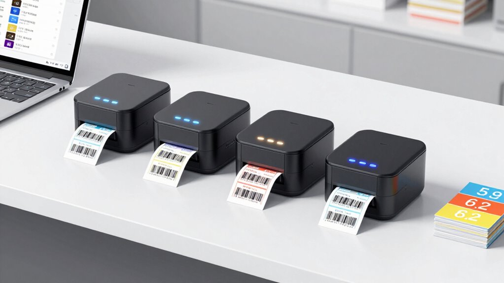 Think of thermal printers like skilled chefs who adapt recipes based on ingredients. They handle different label sizes and materials with adjustable settings, allowing me to switch between small shipping labels and large barcode tags effortlessly. I can choose the right thermal transfer or direct thermal mode, depending on the material’s durability needs. This flexibility guarantees I always get clear, professional labels, no matter the size or type I require.