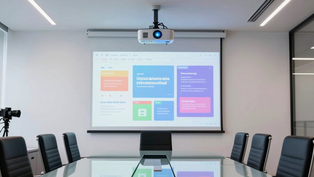 Ultra-short-throw projectors revolutionize workspace ergonomics and setup flexibility—it’s like having a magic wand for your conference room. I find they markedly reduce clutter, as you don’t need long cables or large screens. Plus, their compact size allows me to position them easily without compromising space or comfort. This setup minimizes strain and maximizes room usability, making every presentation seamless and efficient.