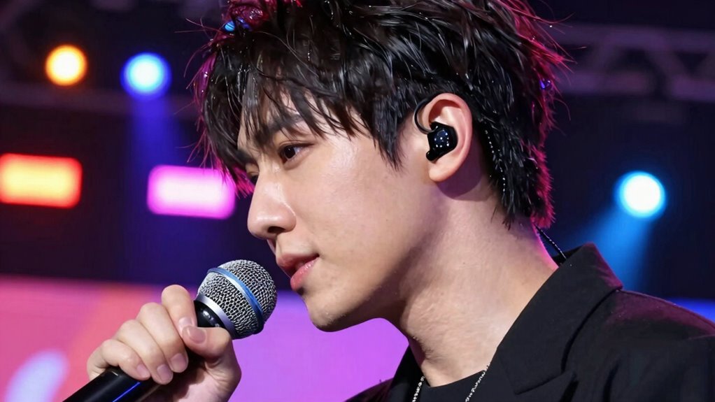 Have you considered how the wireless range of an in-ear monitor system impacts your performance? The range determines how far you can move from the transmitter before audio quality drops or the signal cuts out. Most systems offer ranges between 80 and over 164 feet, but this varies based on the frequency band and environment. Obstructions like walls, stage gear, and metal structures can considerably cut down the effective distance. Line-of-sight conditions give you the maximum range, while non-line-of-sight setups might see shorter distances. Choosing a system with an adequate wireless range is essential for performers who want freedom of movement without fearing signal loss during their performance. Ensuring enough range helps maintain consistent audio and stage confidence.