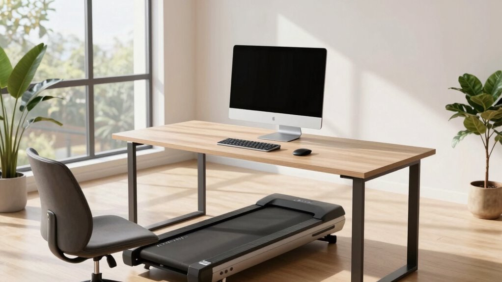 Just like Icarus soared toward the sun, finding the perfect treadmill desk can elevate your productivity without risking a fall. By considering your space, needs, and comfort, you’ll discover a device that keeps you moving and focused. Remember, the right treadmill desk isn’t just about staying active; it’s about creating a sustainable balance—like a well-tuned orchestra—that keeps your work and wellness harmoniously in sync.