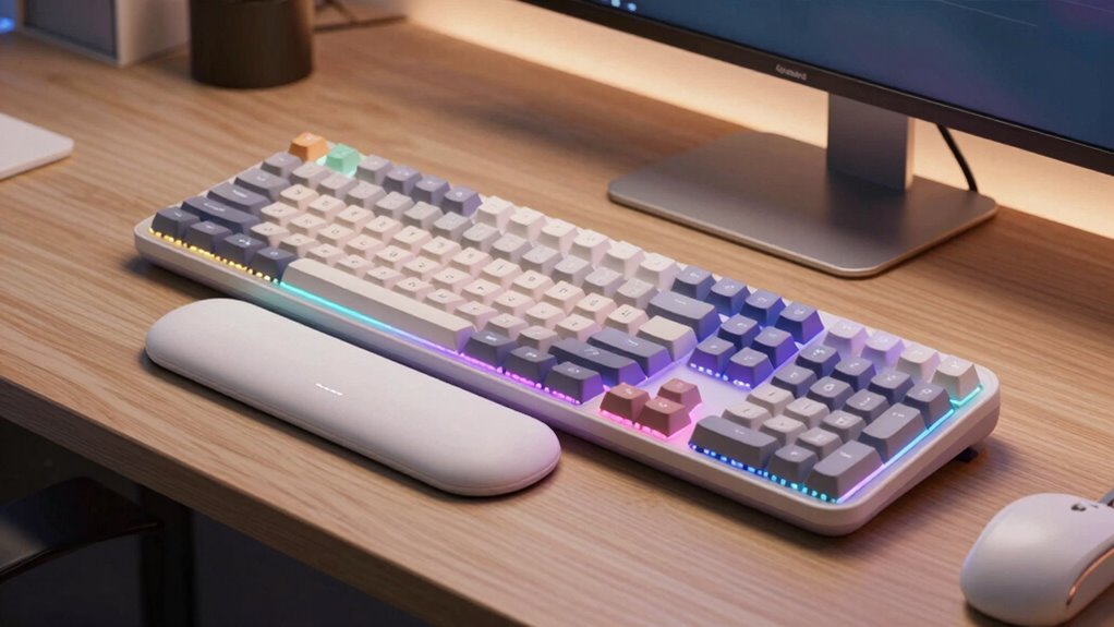 The feel and responsiveness of a keyboard’s switches considerably impact my typing experience, especially during long coding sessions. Mechanical switches like blue, brown, or red offer tactile, audible, or linear feedback, shaping how I perceive each keystroke. Tactile switches provide a noticeable bump, helping me confirm a key press without bottoming out, while linear switches deliver smooth, quiet presses ideal for quick typing. Membrane or rubber dome switches tend to be softer and quieter but lack the tactile feedback that aids accuracy. The actuation force varies between switch types—some require less effort, reducing fatigue, while others emphasize durability and firm feedback. Feedback from switches helps minimize errors and promotes natural, comfortable keystrokes, making switch choice essential for ergonomic, efficient coding.