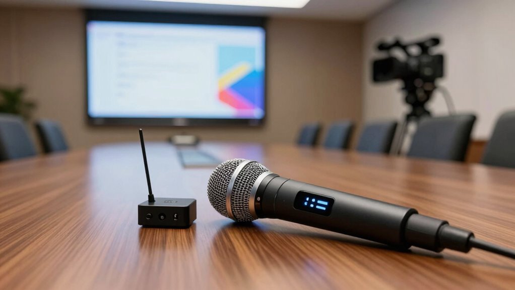 When choosing a wireless handheld microphone system, I consider factors like range, sound quality, and battery life to guarantee reliable performance. Compatibility and interference resistance are also key to avoiding disruptions during presentations. Finally, I look at durability to make sure the mic can withstand frequent use without issues.