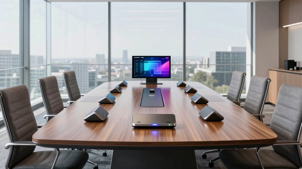 Wireless presentation systems perform quite well in large conference rooms when you choose the right setup. I’ve found that systems with strong signal ranges, multiple access points, and reliable connectivity handle bigger spaces effectively. They reduce lag and interruptions, making presentations smooth. However, I recommend testing your specific environment beforehand, as factors like walls and interference can impact performance. Proper planning guarantees seamless sharing no matter the room size.