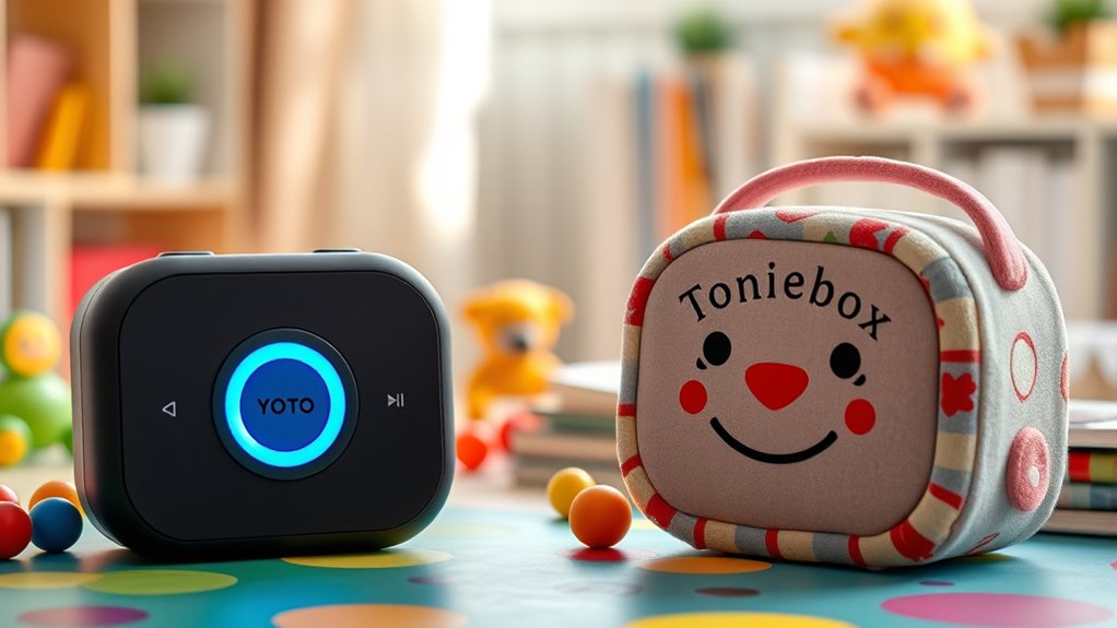 When evaluating the portability and design of the Yoto Player and Toniebox, it’s clear that both are built with kids in mind, prioritizing durability and ease of use. The Yoto Player is compact, featuring a pixel display and lightweight build, making it easy for kids to carry around. The Toniebox has a cube shape with shockproof construction, perfect for active play and travel. Both devices often include carrying cases and adjustable straps, boosting portability. Battery life is impressive too: Yoto supports up to 24 hours of use, while Toniebox offers seamless automatic playback with rechargeable power. Their simple designs, with intuitive controls and minimal setup, encourage independent use, making them practical choices for kids on the go.